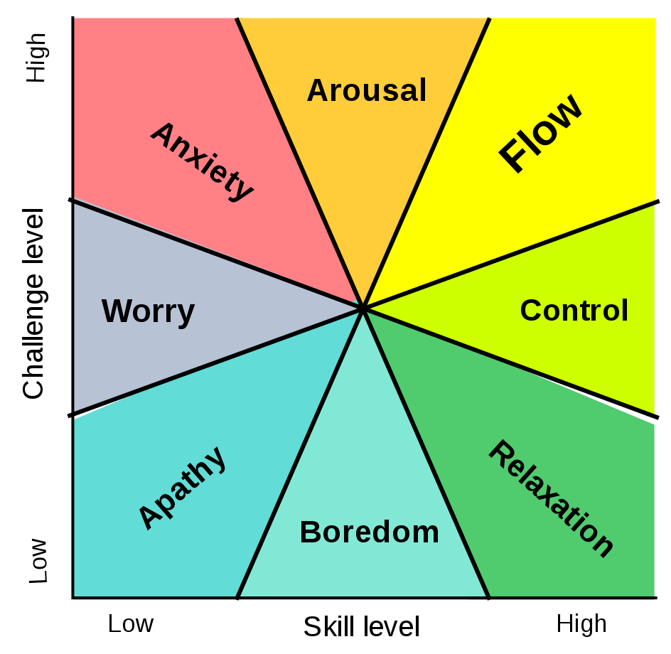 For example, there is a challenge you have to engage and overcome. If this challenge is too complicated, stressful, and overwhelming, then you become anxious and worrisome. If it is too easy, then we feel bored, even apathy.