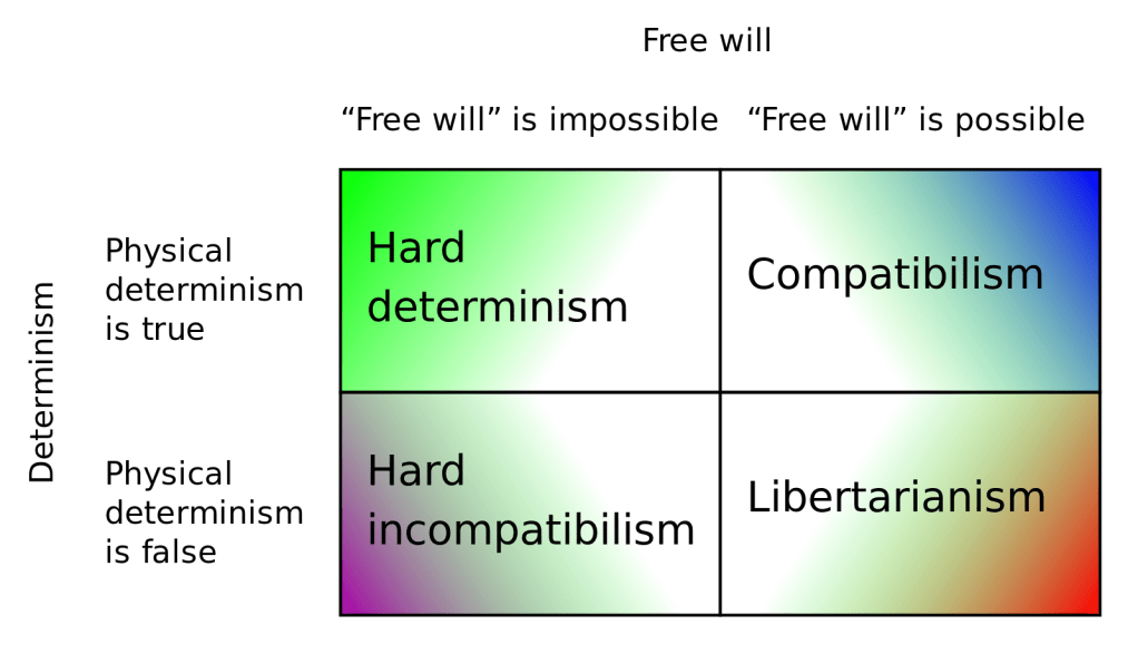 One of the starting points is that there is a free will and determinism distinction. And in this meta-perspective, there are two positions: compatibilism and incompatibilism.