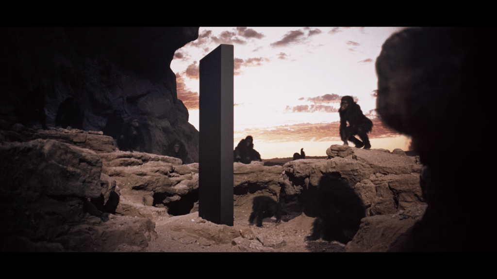 The Monolith stands as the film’s central symbol of higher intelligence, its perfect geometric form suggesting mathematical truth beyond human comprehension. Its appearances mark critical moments in human development: the dawn of tool use, the discovery of extraterrestrial intelligence, and ultimately, humanity’s next evolutionary leap. The Monolith’s stark simplicity – a black rectangle with mathematically significant proportions – paradoxically represents the unlimited complexity of divine or alien intelligence. It appears both physical and metaphysical, technological and mystical, reflecting humanity’s eternal struggle to grasp what lies beyond our understanding.