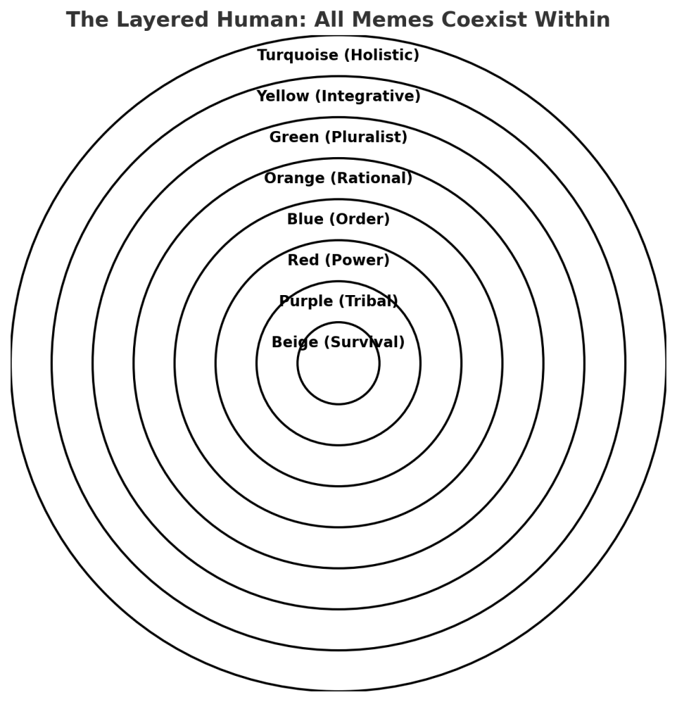 Crucially, development does not erase earlier memes. Red remains inside Blue. Orange still carries Purple. Green still has Red impulses. We do not discard our past. We stack it. This is why the most progressive person can act with primitive cruelty under stress, and why the most traditional person can surprise with creativity or empathy.